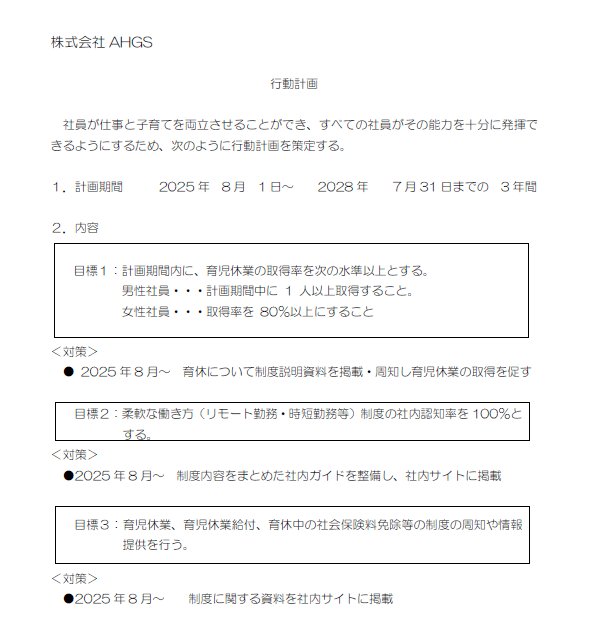 株式会社AHGSは、社員が仕事と子育てを両立させることができすべての社員がその能力を十分に発揮できるようにするために行動計画を策定いたします。